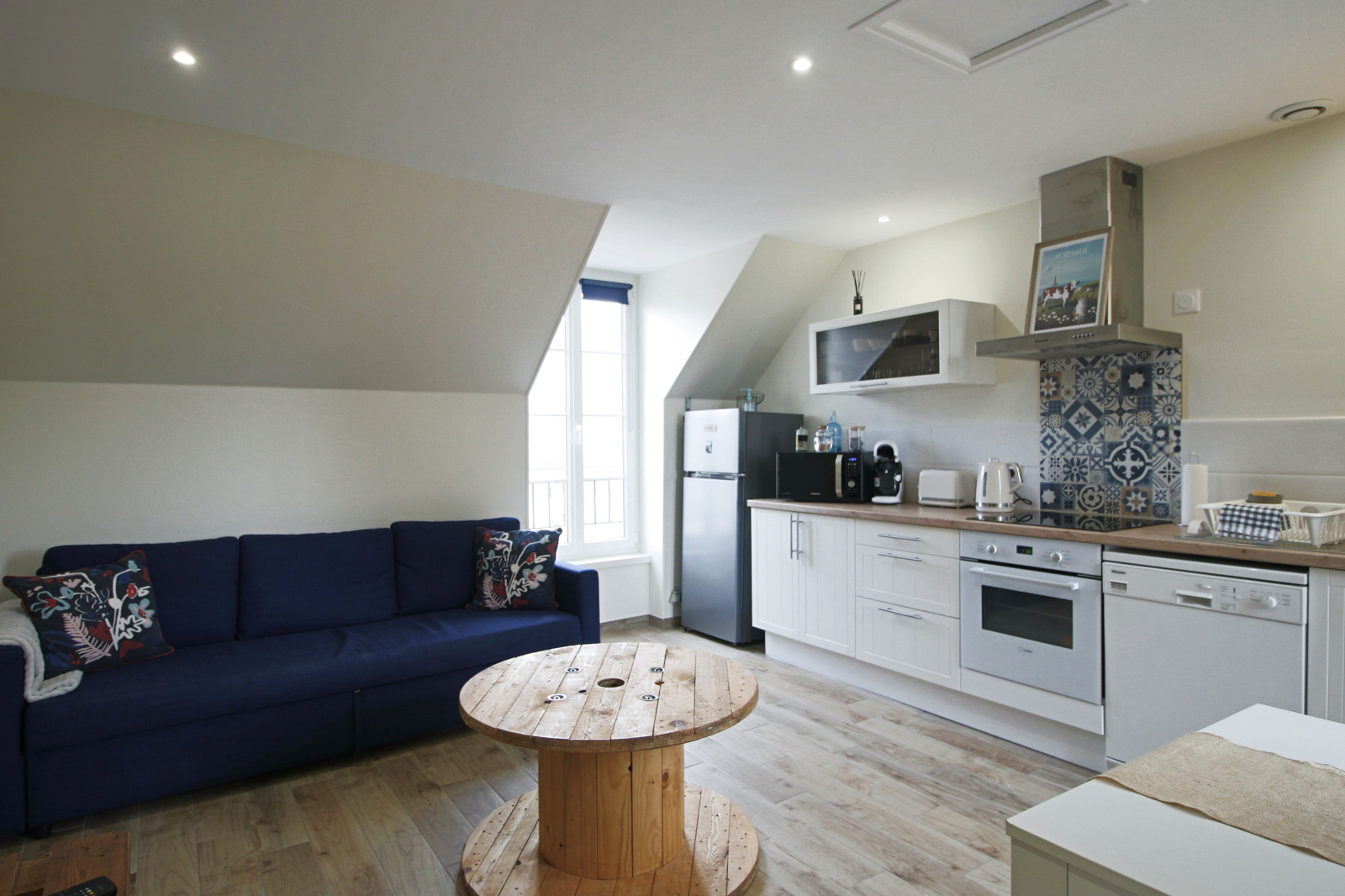 - Un salon lumineux avec cuisine ouverte aménagée et équipée