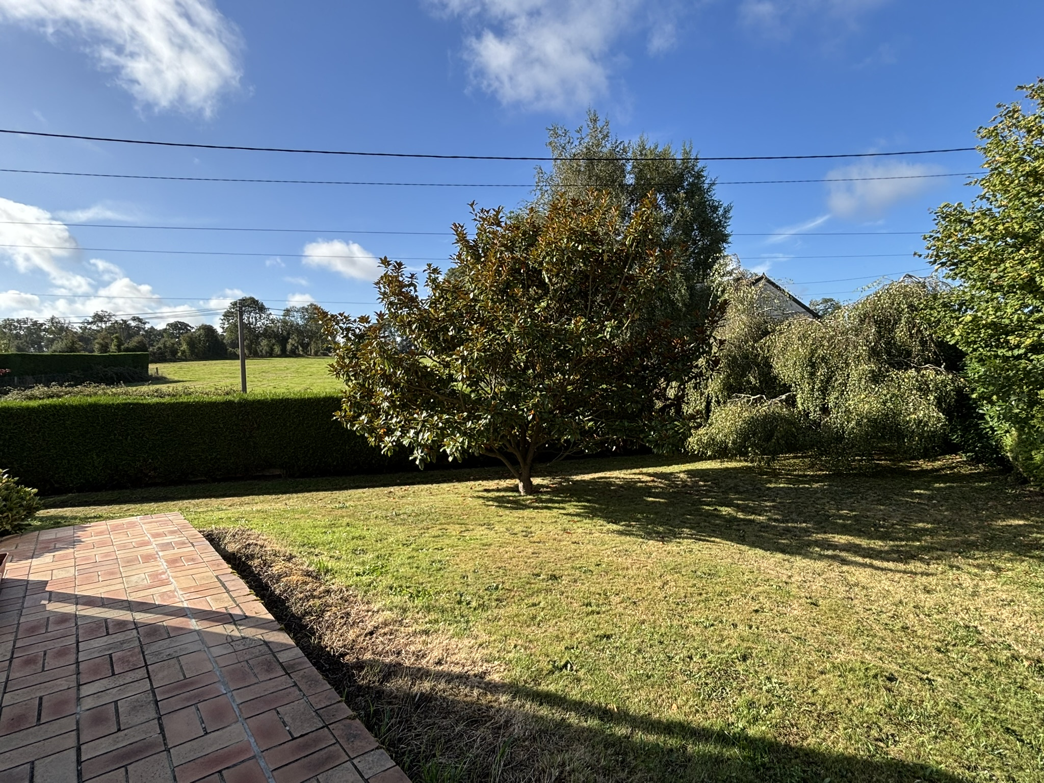 À l’extérieur, le jardin paysagé, parfaitement entretenu, s’ouvre sur une vue dégagée.
